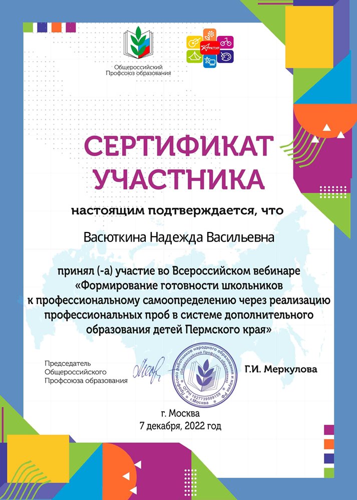 7 декабря 2022 года Васюткина Н.В., методист МБУДО "Жирновский ЦДТ" приняла участие во Всероссийском вебинаре Общероссийского Профсоюза образования по теме: "Формирование готовности школьников к профессиональному самоопределению через реализацию профессиональных проб в системе дополнительного образования Пермского края".